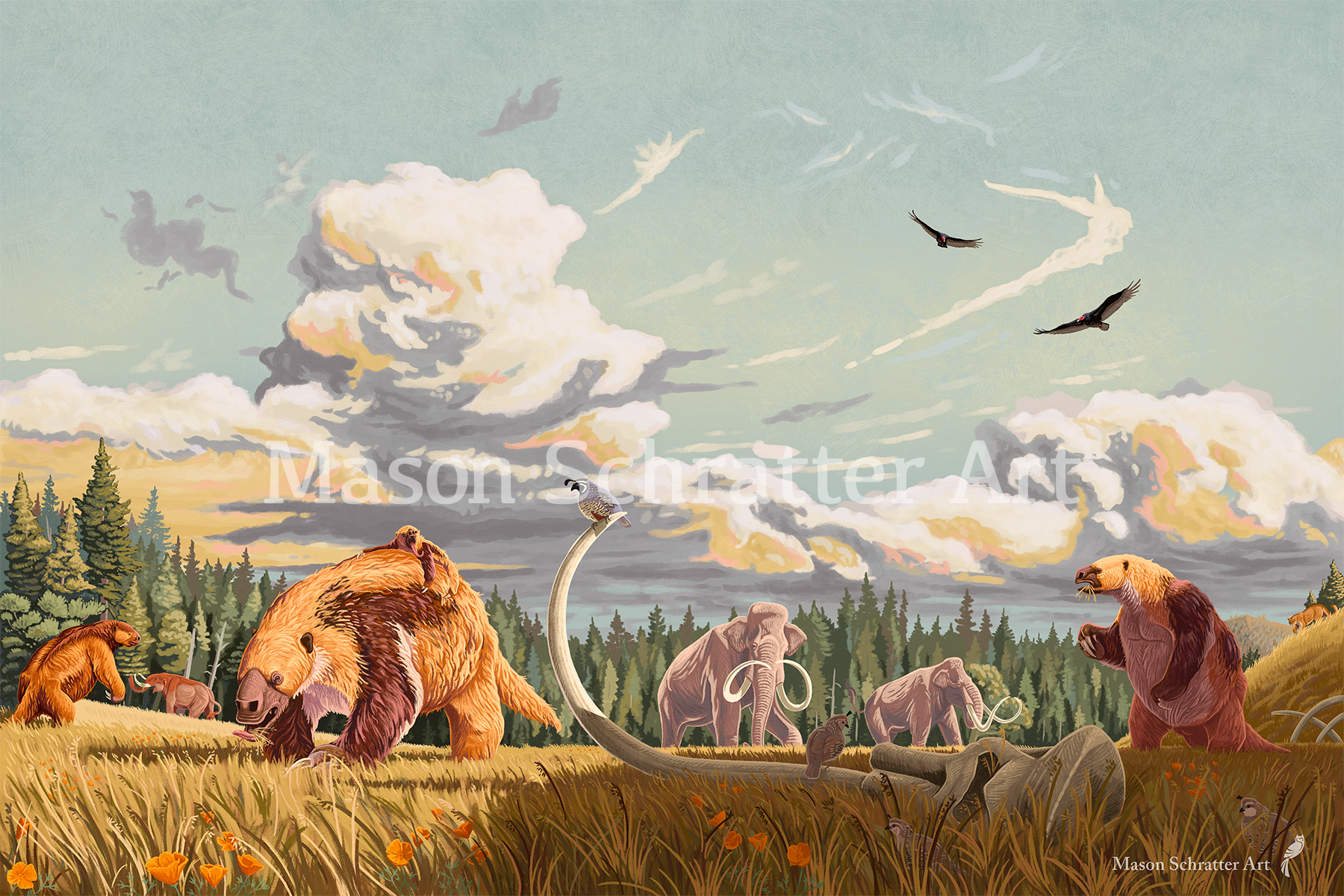 In 2025, it was announced that additional ground sloth material had been found in Santa Cruz county, this time of paramylodon. I created a landscape scene as a companion to the first panel I illustrated, showing a more open environment where paramyldon would have been found. The grazing habits of paramylodon and mammoths are highlighted compared to the browsing habits of megalonyx and mastodon.
