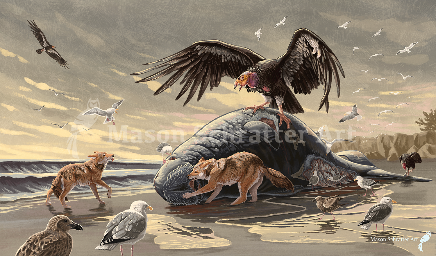 A lovely beach picnic from the Pleistocene of California’s coast 17000 years ago. In 1960, the skull of hydrodamalis, the giant Steller’s sea cow, was caught in a trawl net somewhere in the Monterey Bay (written about briefly by Robert E. Jones in ‘67). Here, a young female has washed ashore, where it serves as a tough opportunity for scavengers. Gymnogyps amplus, a larger relative of the California condor, claims its authority. Two Pleistocene coyotes, more robust than their modern counterparts, gnaw at the tough hide. And no beach picnic can escape swarms of Western gulls.